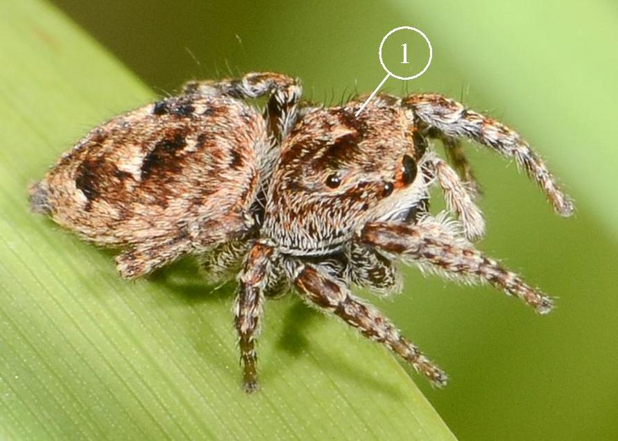 Femelle : dans les tons roussâtres avec une flèche au centre du prosoma 1 et une série de taches blanches sur l’abdomen.