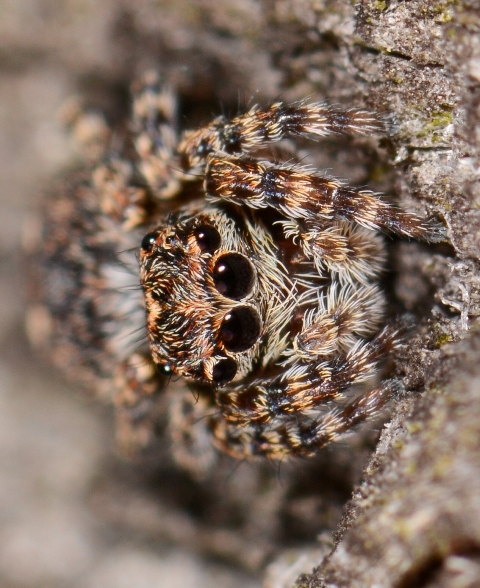 Femelle : d’allure plutôt trapue et globalement brune, avec des poils noirs, blancs et roux. Céphalothorax de forme plutôt carrée avec une tache blanchâtre parfois triangulaire sur la zone médiane entre la paire d’yeux IV 1. Il est possible de distinguer souvent un demi-cercle noir à l’arrière du triangle blanc 2.